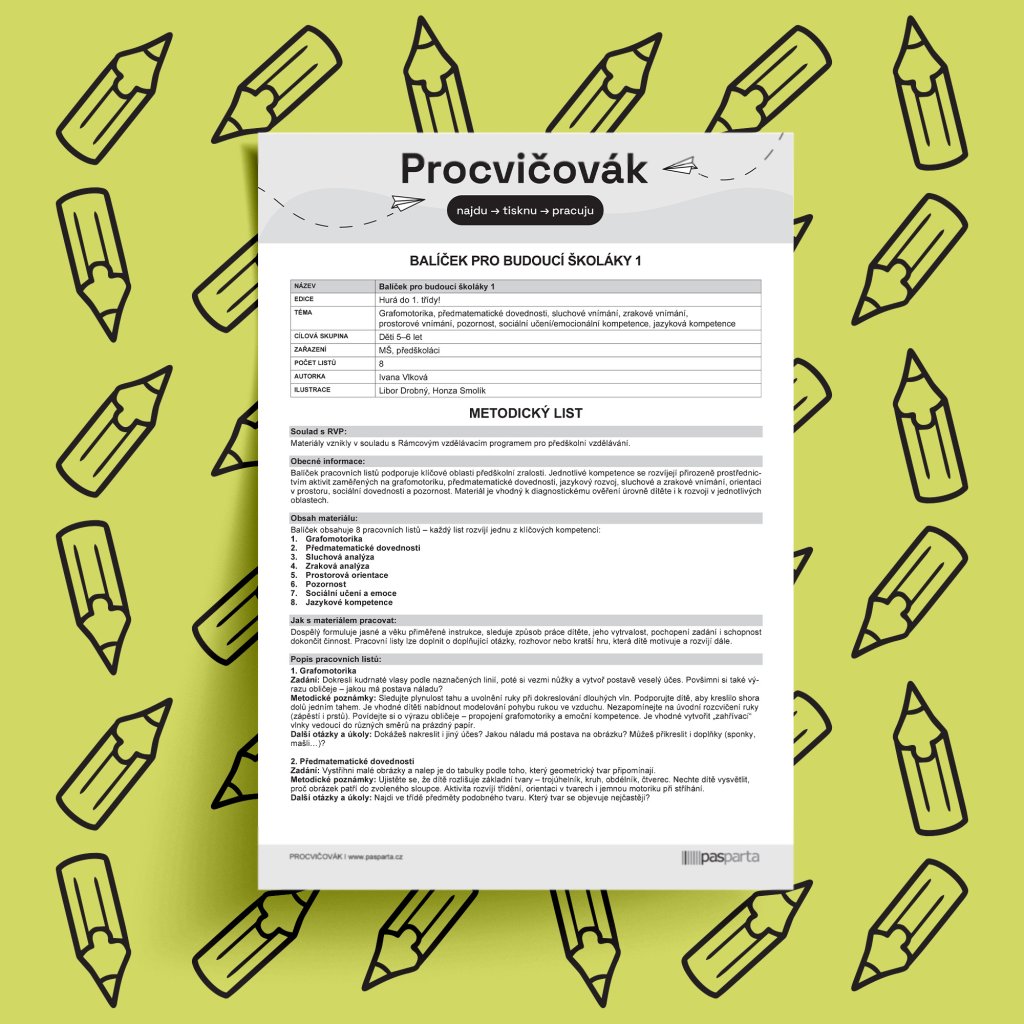 Balíček 8 pracovních listů podporuje klíčové oblasti předškolní zralosti. Jednotlivé kompetence se rozvíjejí přirozeně prostřednictvím aktivit zaměřených na grafomotoriku, předmatematické dovednosti, jazykový rozvoj, sluchové a zrakové vnímání, orientaci v prostoru, sociální dovednosti a pozornost.