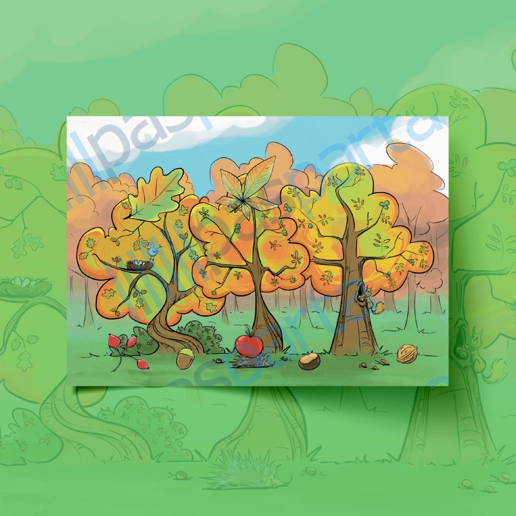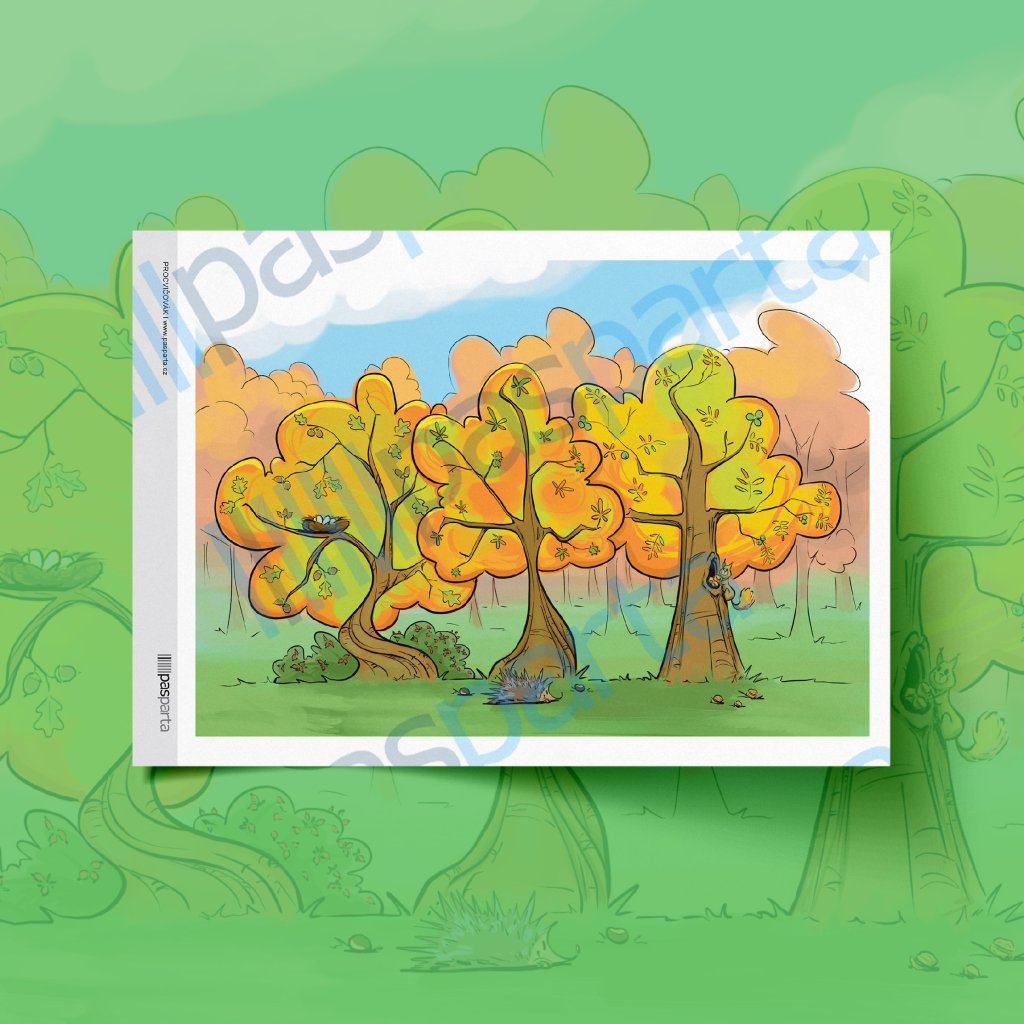 Děti mají za úkol přiřazovat plody a listy na obrázek podzimní krajiny. Na obrázku jsou vidět stromy a jejich plody, které z nich padají na zem. V krajině se pohybují také zvířátka – ježek, veverka, ptáci.