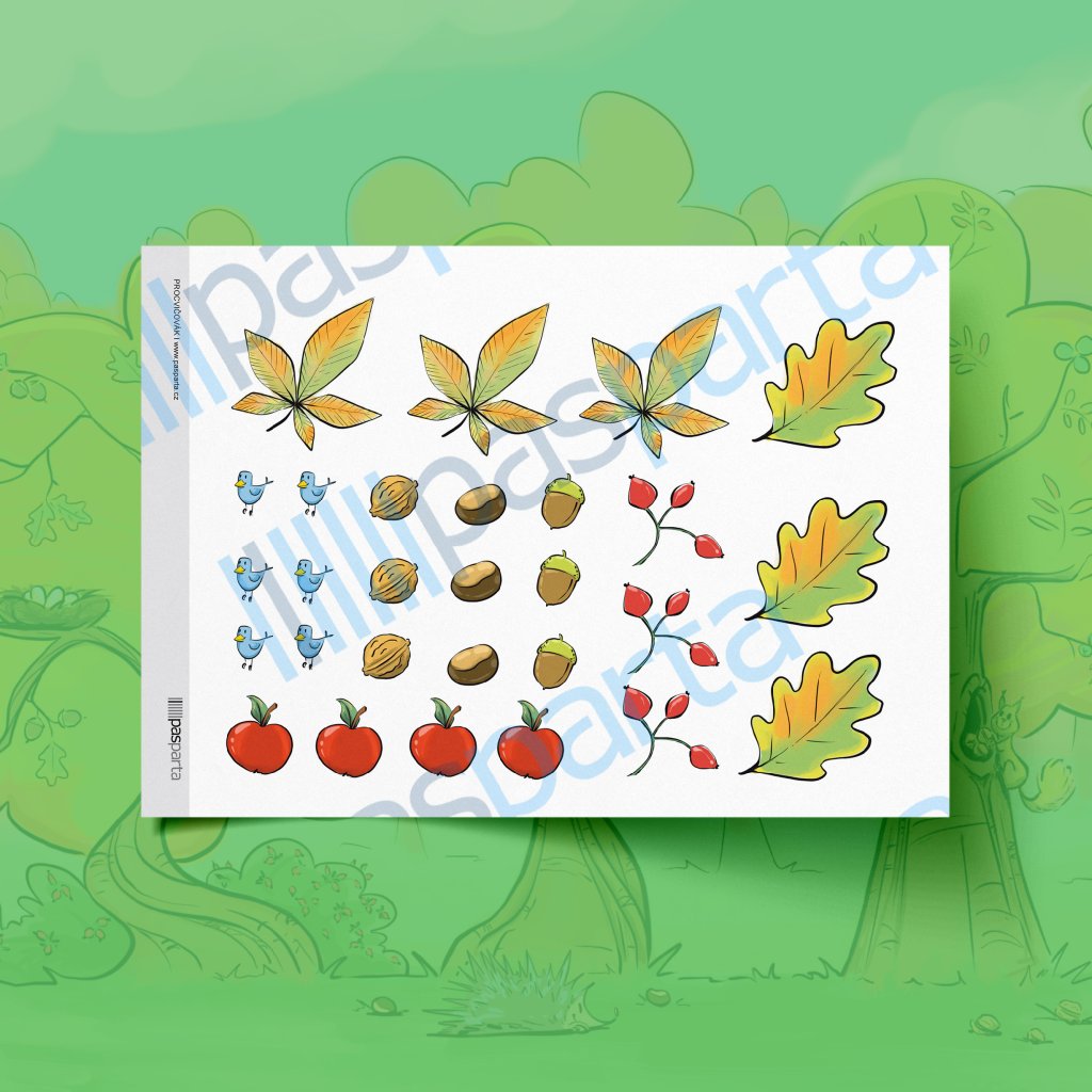 Materiál obsahuje 2 pracovní listy: 1× list s podkladem a 1× list s podzimními plody a listy k vystřižení.